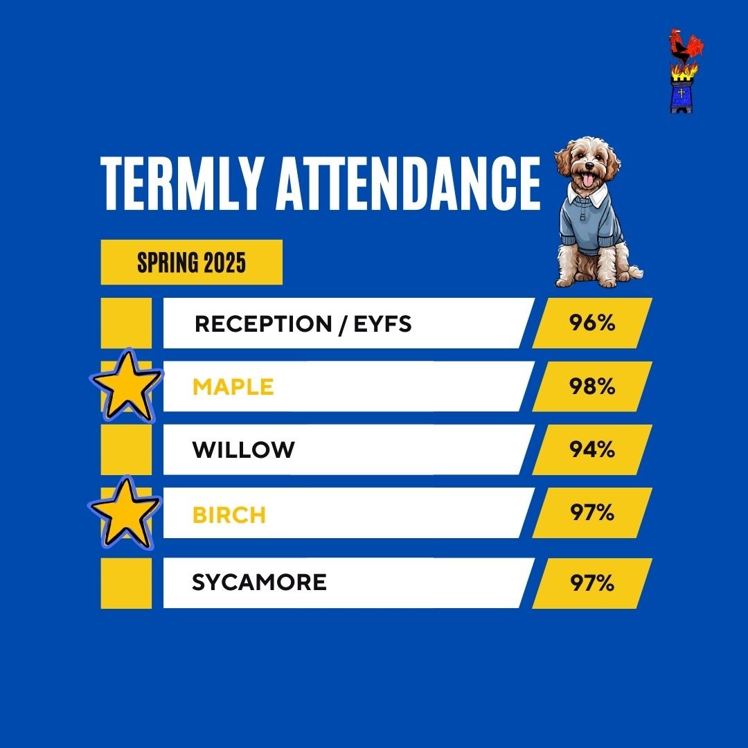 As well as celebrating our weekly attendance awards, we like to look to see which class has the highest average attendance across the term. This time, in KS1 and EYFS, it's Maple who take the crown with 98%. In KS2, Birch narrowly squeezed out Sycamore by half a percent!Â